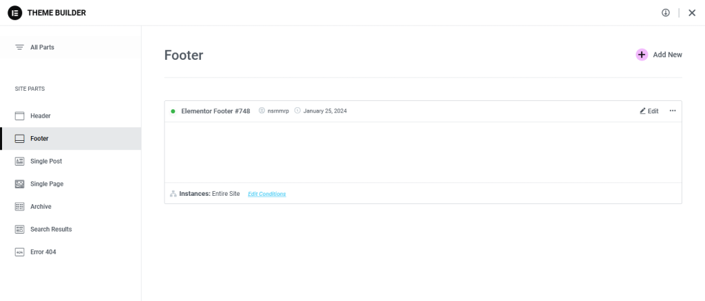 Pastikan bagian footer sudah dibuat di theme builder, masuk kebagian footer dan pilih edit