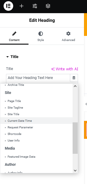 Klik tahan dan lepaskan pada section, selanjutnya pada kolom title klik icon record dan pilih current date time